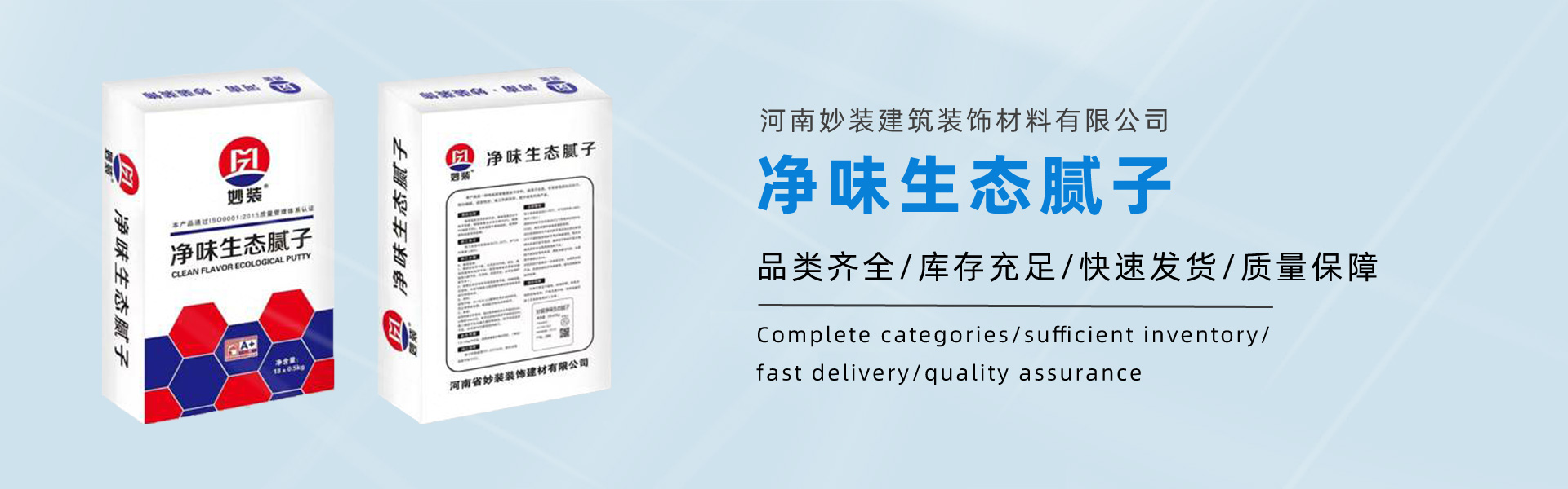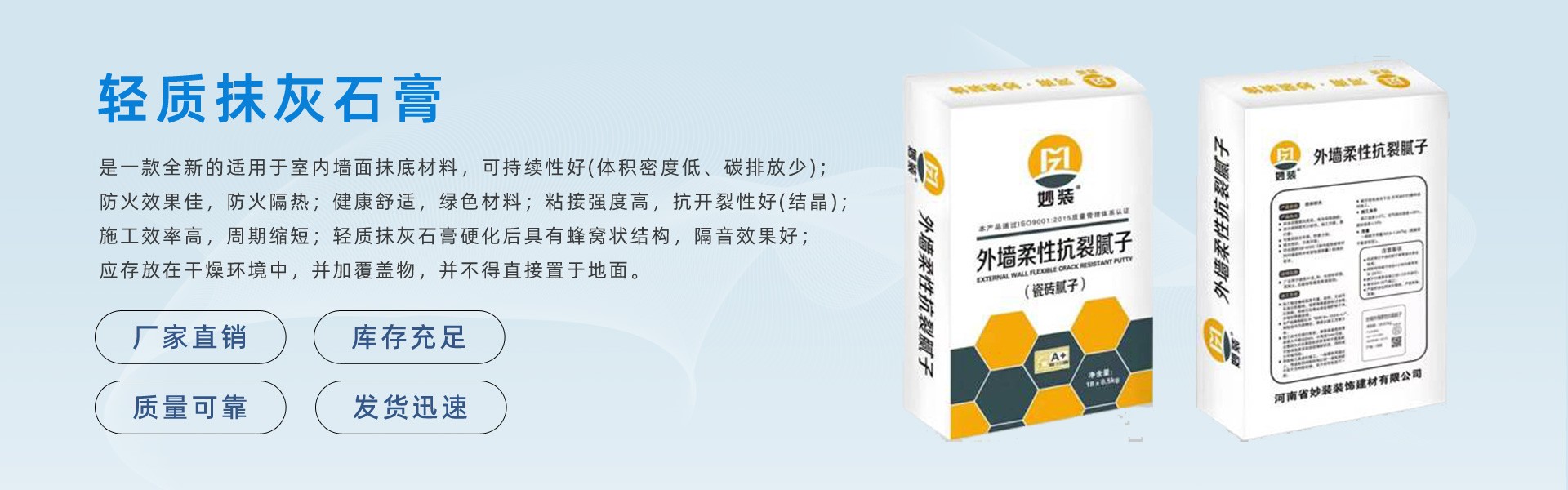 ????????河南妙裝建筑裝飾材料有限公司位于冀、魯、豫三省交界處——濮陽,交通便利,濮鶴高速,京珠高速,大廣高速等交通要道四通八達;是一家集水性涂料研發(fā)、生產(chǎn)、銷售、服務(wù)為一體的現(xiàn)代化建材科技公司。公司專注于環(huán)保水性涂料、建筑石膏、膩子的研發(fā)與創(chuàng)新,擁有可靠的研發(fā)和技術(shù)團隊、先進的全自動一體化生產(chǎn)設(shè)備及研發(fā)測試設(shè)備和高效的管理運營團隊。公司產(chǎn)品主要涵蓋工程水漆、家裝水漆、建筑石膏、膩子體系,被廣泛應(yīng)用到建筑、鋼構(gòu)等多個行業(yè)。妙裝裝飾材料憑借完善的研發(fā)、生產(chǎn)、銷售和服務(wù)體系,在行業(yè)中享有盛譽。 公司始終秉承“實實在在做人,實實在在服務(wù)”的經(jīng)營理念,引導(dǎo)著企業(yè)健康快速發(fā)展。使得公司的美譽度持續(xù)提升,為企業(yè)贏得了眾多優(yōu)質(zhì)的戰(zhàn)略合作伙伴,嚴格按照管理認證體系管控企業(yè)的運營和發(fā)展。